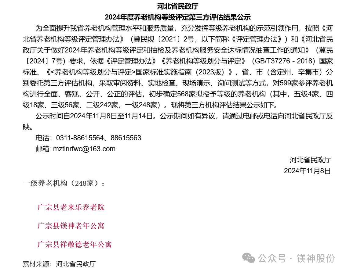 新聞?wù)?近日,河北鎂神科技股份有限公司旗下的廣宗縣鎂神老年公寓通過(guò)養(yǎng)老機(jī)構(gòu)等級(jí)評(píng)定,獲河北省一級(jí)養(yǎng)老機(jī)構(gòu)。